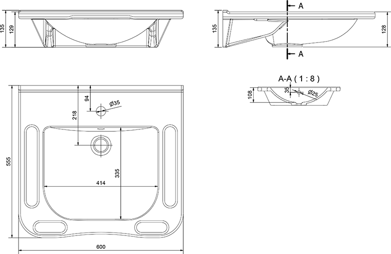Verschiedene Modelle von Waschbecken mit/ohne Überlauf, ohne Griffe oder mit mehreren Griffoptionen. Variante wählen